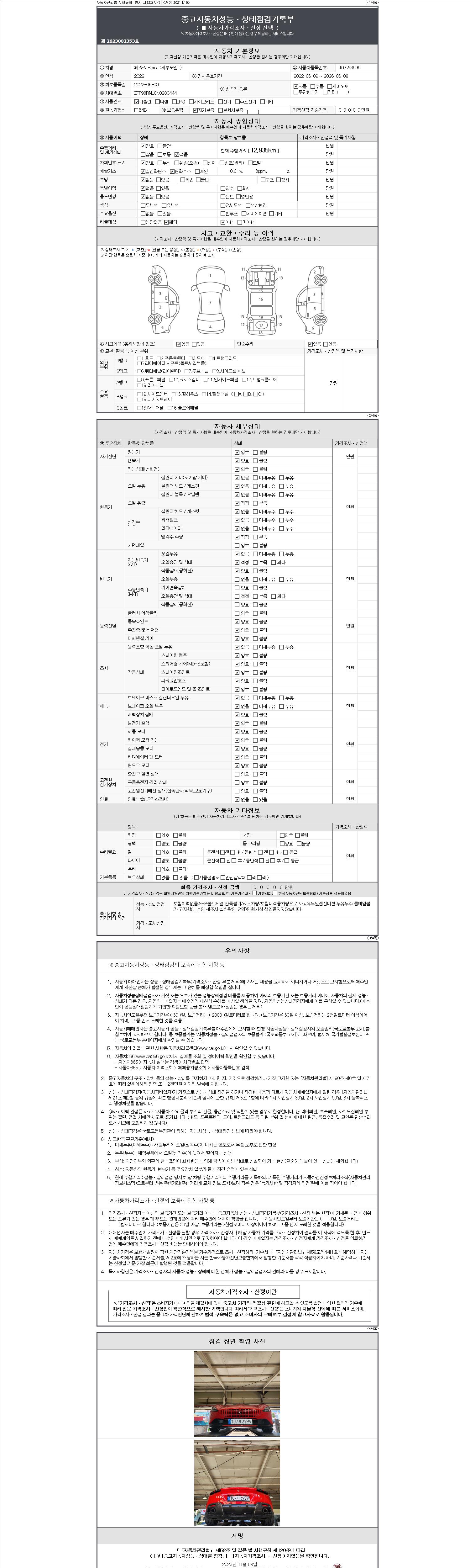 -중고자동차 매매업자를 통해 차량을 구입하실 경우 반드시 "중고자동차 성능, 상태점검 기록부"를 교뷰 받으셔야 하며, 매매업자는 반드시 의무 교부 하여야 압니다.