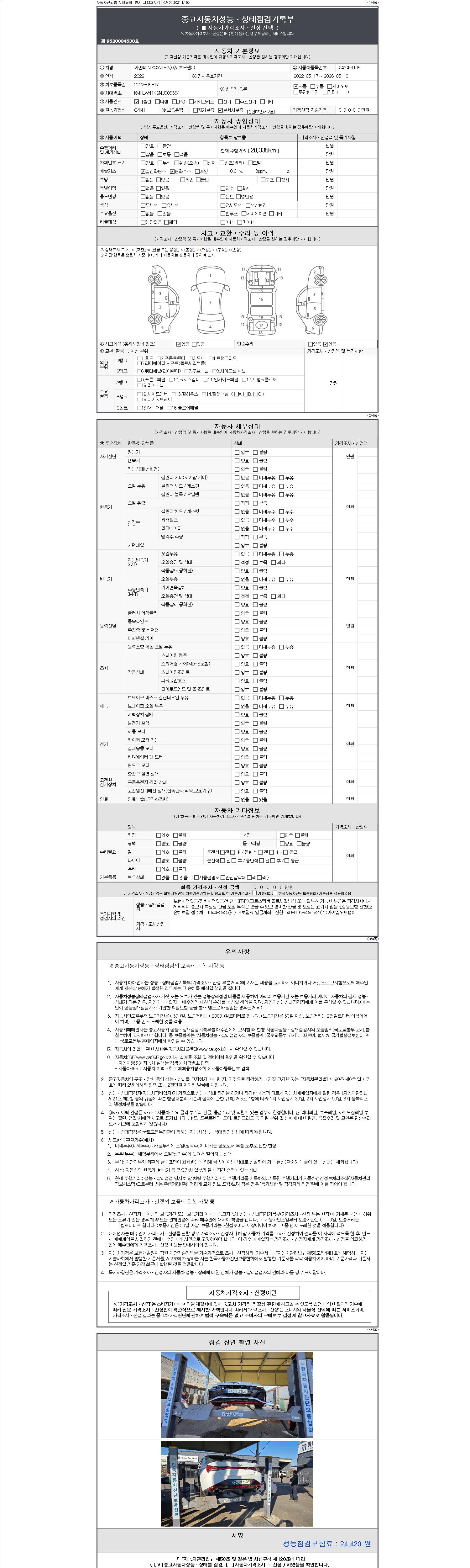 자동차관리법 시행규칙 제120조의 규정에 따라 별지 제 82호서식 《중고자동차 성능, 상태점검 기록부》를 발행한 성능, 상태점검자 및 매매자는 아래의 보증기간 또는 보증거리 이내의 중고자동차, 성능점검 기록부에 기재된 내용과 자동차의 실제 성능, 상태가 다른 경우 계약 또는 관계법령에 따라 매수인에 대하여 책임을 집니다.