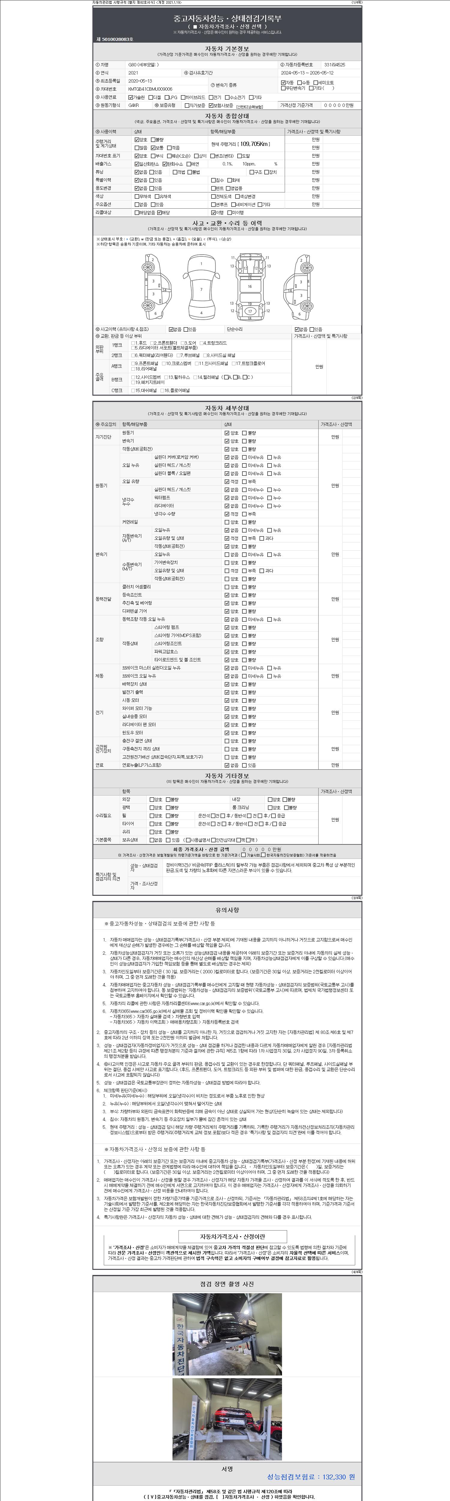 자동차관리법 시행규칙 제120조의 규정에 따라 별지 제 82호서식 《중고자동차 성능, 상태점검 기록부》를 발행한 성능, 상태점검자 및 매매자는 아래의 보증기간 또는 보증거리 이내의 중고자동차, 성능점검 기록부에 기재된 내용과 자동차의 실제 성능, 상태가 다른 경우 계약 또는 관계법령에 따라 매수인에 대하여 책임을 집니다.