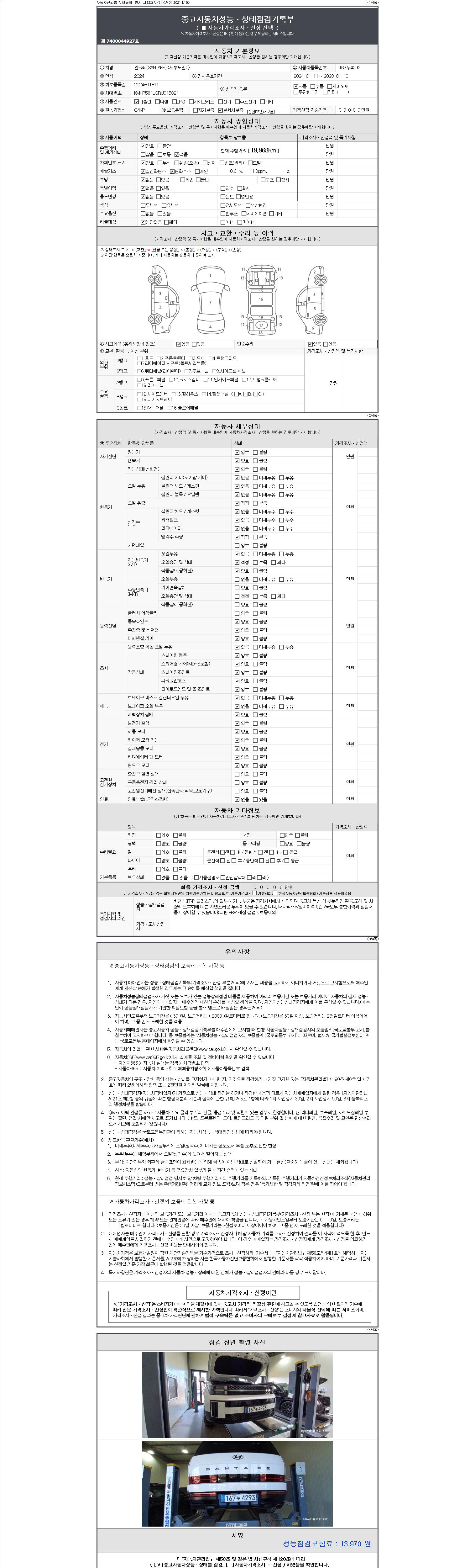 자동차관리법 시행규칙 제120조의 규정에 따라 별지 제 82호서식 《중고자동차 성능, 상태점검 기록부》를 발행한 성능, 상태점검자 및 매매자는 아래의 보증기간 또는 보증거리 이내의 중고자동차, 성능점검 기록부에 기재된 내용과 자동차의 실제 성능, 상태가 다른 경우 계약 또는 관계법령에 따라 매수인에 대하여 책임을 집니다.