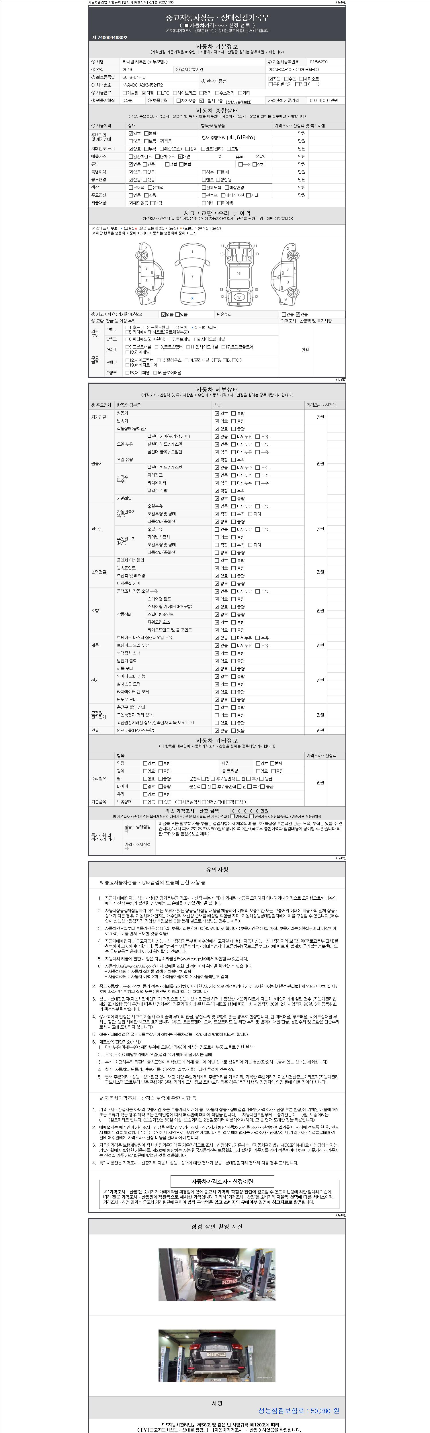 자동차관리법 시행규칙 제120조의 규정에 따라 별지 제 82호서식 《중고자동차 성능, 상태점검 기록부》를 발행한 성능, 상태점검자 및 매매자는 아래의 보증기간 또는 보증거리 이내의 중고자동차, 성능점검 기록부에 기재된 내용과 자동차의 실제 성능, 상태가 다른 경우 계약 또는 관계법령에 따라 매수인에 대하여 책임을 집니다.