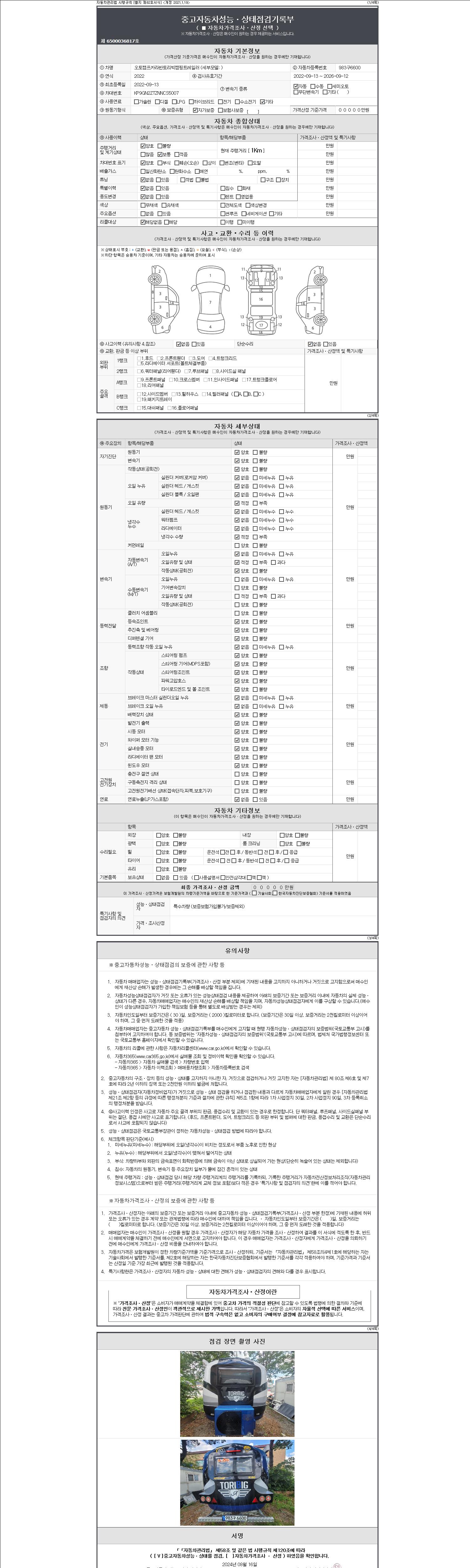 자동차관리법 시행규칙 제120조의 규정에 따라 별지 제 82호서식 《중고자동차 성능, 상태점검 기록부》를 발행한 성능, 상태점검자 및 매매자는 아래의 보증기간 또는 보증거리 이내의 중고자동차, 성능점검 기록부에 기재된 내용과 자동차의 실제 성능, 상태가 다른 경우 계약 또는 관계법령에 따라 매수인에 대하여 책임을 집니다.